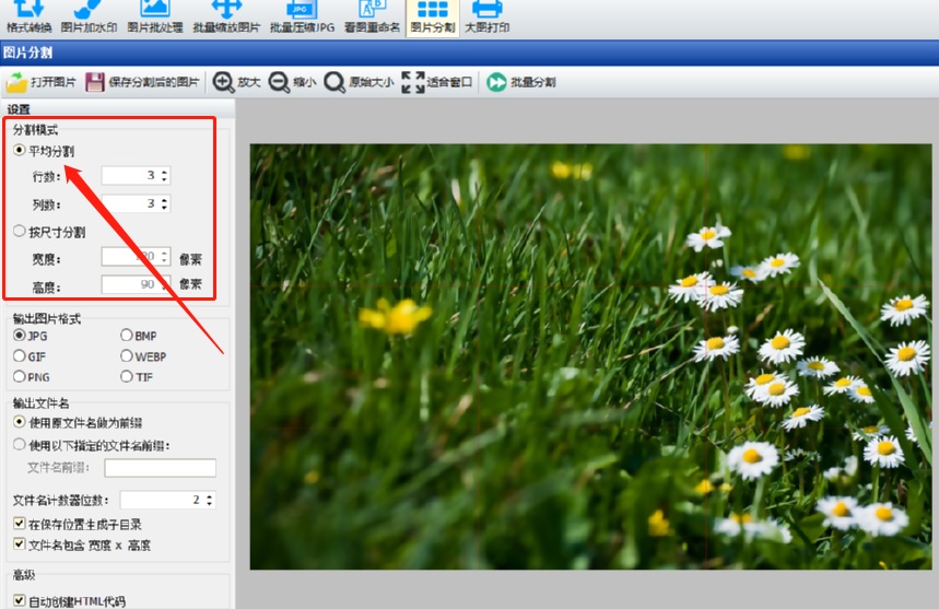 3.点击打开按钮之后选择的图片就添加到软件界面中了,然后我们点击界面左边分割模式的位置可以选择想要分割图片的模式,平均分割的话需要输入分割的行数和列数。