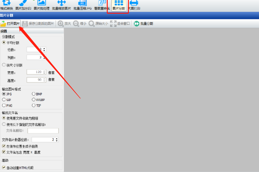 1.首先第一步我们打开软件之后在软件界面上方点击图片分割这个功能,点击之后在出现的界面左上方点击打开图片这个功能选项。