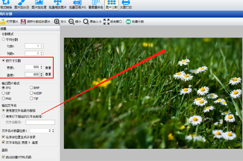 4.另外还有按尺寸分割的方式,用户可以根据自己的需求来输入想要分割的尺寸,然后在界面中可以看到红色的分割辅助线,查看分割之后的效果。