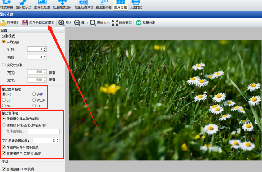 5.选择好分割图片的方式之后,我们点击界面左边的输出图片格式这个选项,可以对图片的输出格式进行选择,还有输出文件名也是可以进行设置的,根据自己的需求设置完成之后我们点击左上方的“保存分割后的图片”这个功能按钮。