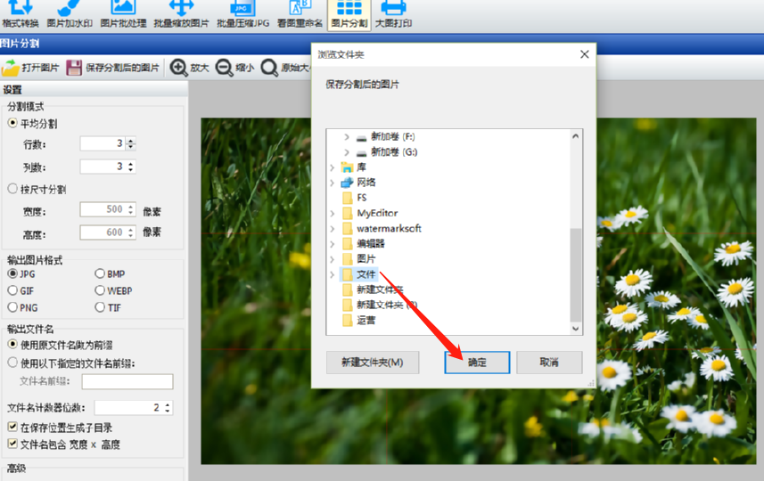 6.点击保存分割图片的按钮之后我们就可以在出现的界面中选择分割之后的图片想要储存的位置了,选择之后点击确定按钮即可开始分割保存图片。
