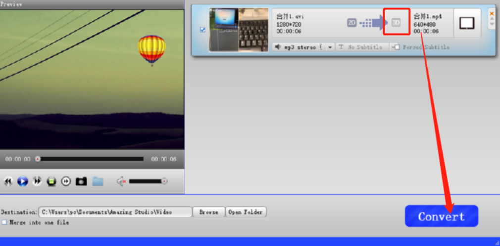 6.最后回到软件的主界面中我们可以看到在转换视频的位置已经变成了3D视频,确认转换的话我们点击下方的Convert按钮即可开始转换,转换完成之后会自动打开转换的文件供用户查看。