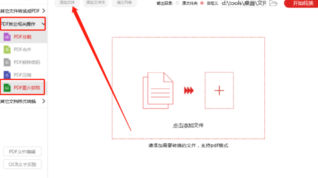1.首先第一步我们打开软件之后在界面的左边列表中打开PDF其他相关操作这个选项,然后在出现的界面中点击PDF图片提取功能并点击界面中的添加文件按钮。