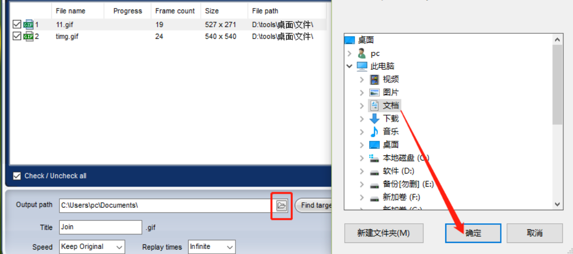 5.调整好合并顺序之后我们点击输出路径右边的文件夹图标,点击这个文件夹图标可以打开选择输出保存文件夹的界面,根据自己的需求选择之后点击确定按钮即可。