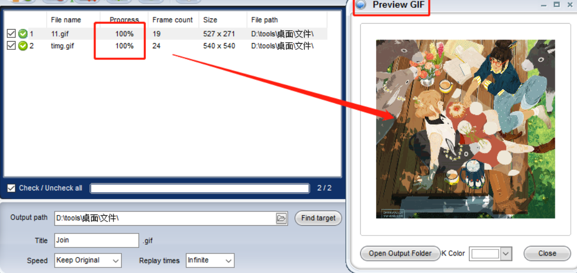 7.开始合并操作之后等到合并完成,我们就可以在界面中看到进度为100%了,并且会自动打开预览GIF图像的界面供用户查看合并的GIF。