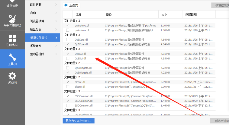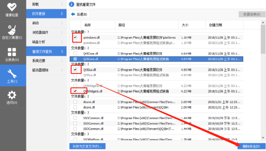 4.等到扫描完成之后我们可以看到重复的文件会被分组显示,然后我们勾选每一组重复文件中想要删除的文件方框,点击右下角的删除所选这个功能按钮。