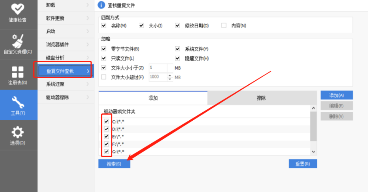 2.进入到工具界面之后我们在功能中找到重复文件查找这个选项并点击选择,然后在右边的界面中选择想要查找重复文件的磁盘,勾选之后点击搜索按钮。