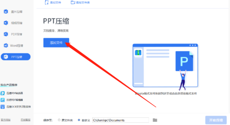 2.进入到PPT压缩功能界面之后,我们点击界面中的添加文件按钮就可以选择将想要压缩的文件添加到软件界面中了。
