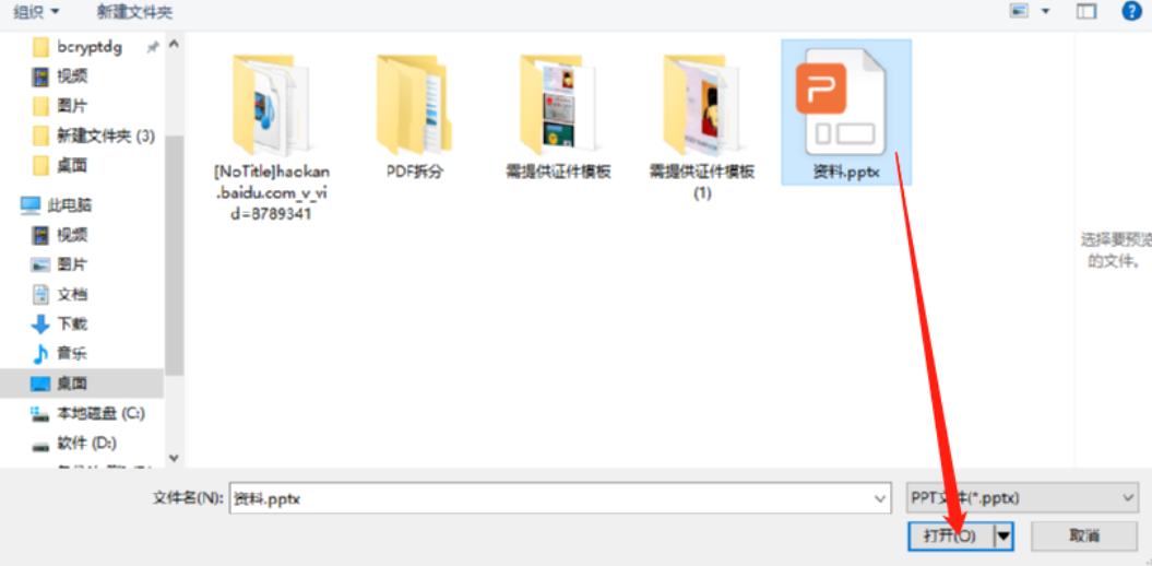 3.点击添加之后会出现一个选择文件的界面,在这个界面中我们选中目标PPT文件之后点击界面下方的打开这个功能按钮即可。
