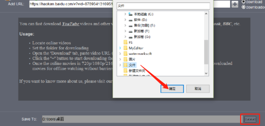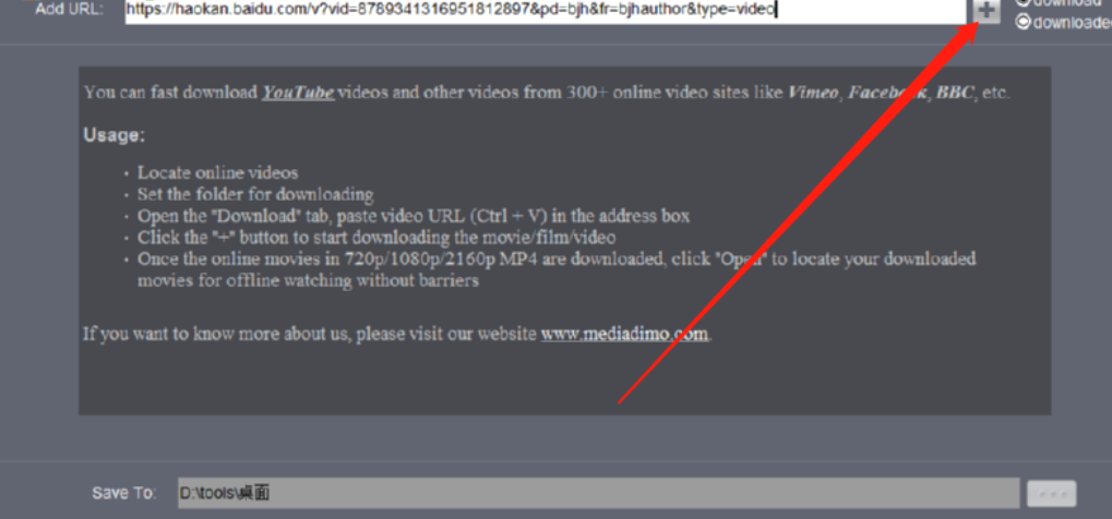 4.点击确定按钮之后视频的下载保存位置就选择完成了,然后我们点击视频地址栏右边的加号图标即可开始下载该链接中的视频。