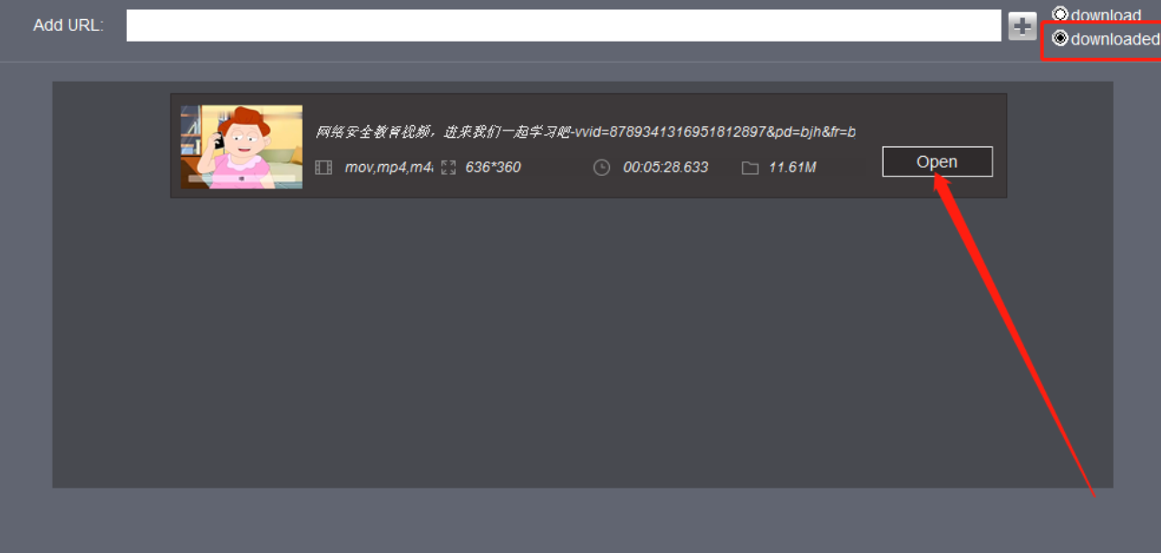 6.最后等到下载完成之后,我们点击选中downloaded这个已下载选项,然后就可以看到下载好的视频文件了,点击Open按钮即可打开视频进行查看。