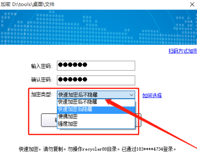 5.设置好加密文件的密码之后下一步可以选择加密类型,有加密并隐藏、便捷加密、强度加密等多个选项,用户根据自己的需求选择即可。