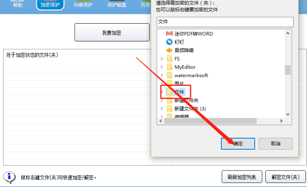 3.点击我要加密之后就会出现一个选择文件的界面,在这个界面中我们选中想要加密的文件或者文件夹并点击确定按钮。