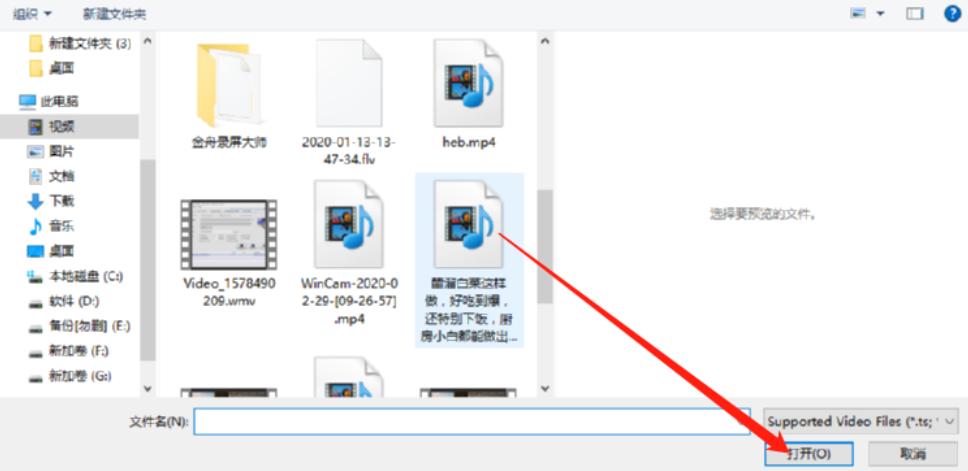 4.点击加号之后接下来会打开一个选择文件的界面,在这个界面中我们找到想要制作的目标视频文件,选中之后点击右下角的打开按钮。
