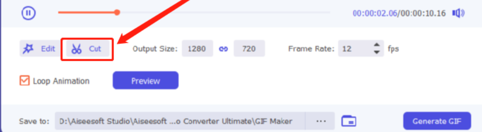 5.点击打开按钮之后我们就会进入到下图所示的界面了,可以选择将整个视频转换制作成GIF动态图,也可以点击Cut这个按钮来剪切自己想要的视频片段。