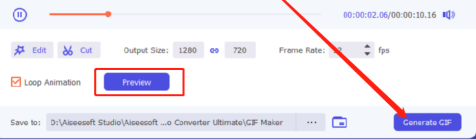 8.最后剪切好想要制作成GIF视频的片段之后,点击界面中的Preview这个按钮可以预览制作成GIF动态图之后的效果,点击Generate GIF这个按钮即可开始制作GIF,制作完成会自动打开GIF文件供用户查看。