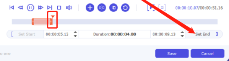 7.下一步我们移动指针到想要剪切视频片段的结束时间位置之后,点击Set End这个按钮即可设置结束时间,剪切好目标视频片段之后点击Save按钮即可保存。