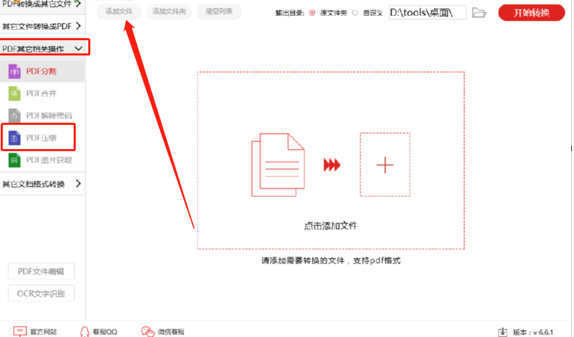 1.首先第一步我们打开软件之后在界面左边点击打开PDF其他相关操作这个选项,打开之后在出现的选项中点击选择PDF压缩这个功能,然后点击添加文件按钮。