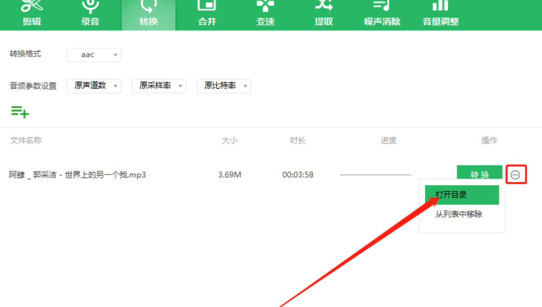 6.最后等到转换完成,我们点击操作下面的三点图标,在出现的选项中点击打开目录选项就可以查看转换之后的文件了。