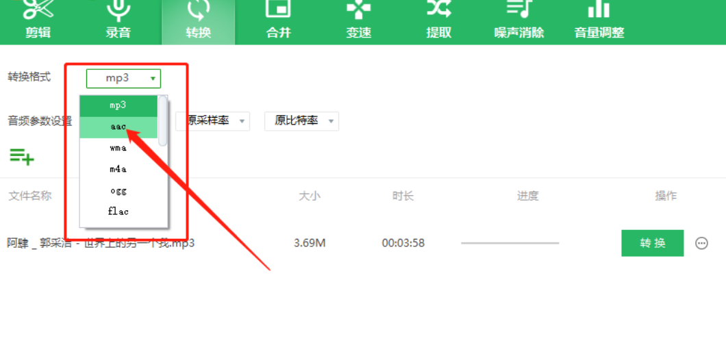 3.点击打开按钮之后音频文件就成功添加到界面中了,然后我们可以在转换格式的位置来选择想要转换的格式,打开下拉列表之后在其中选择AAC格式即可。