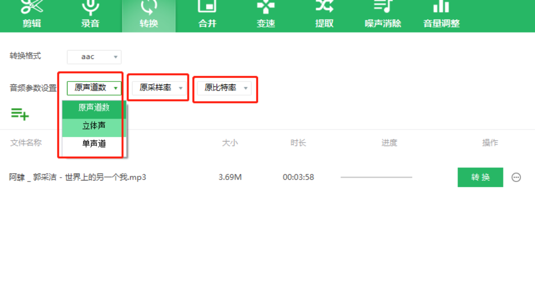 4.设置好转换的格式之后还有一些音频参数可以设置,包括声道、采样率、比特率这三个参数,用户根据自己的需求设置即可,也可以都使用原来音频的参数。
