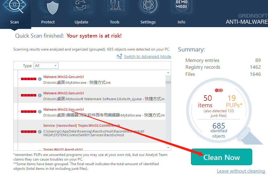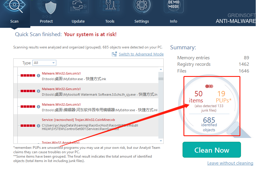5.最后我们在了解电脑中存在的病毒文件之后,点击界面中的Clean Now这个开始清理按钮就可以将这些病毒文件给清理掉了。