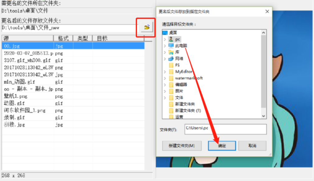 5.我们选择好想要使用的重命名功能之后,点击界面中的文件夹图标,然后可以选择文件重命名之后的输出保存位置,如下图中所示。