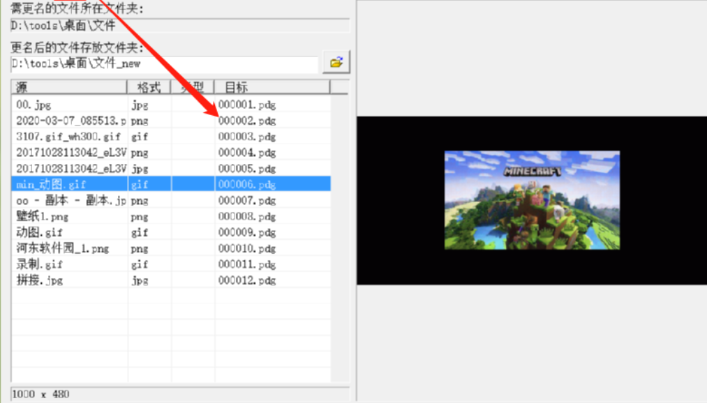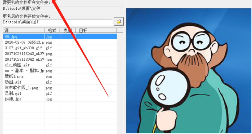 4.另外一种就是单独的重命名文件,不转换格式的功能,点击下图中框出的图标就可以只按照顺序重命名文件了,文件的格式不会受到改变,在下方的目标这一列可以查看效果。