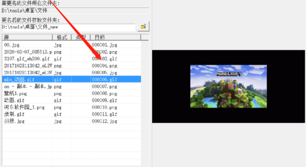 3.选择好目标文件夹之后,软件会自动识别文件夹中的图片文件,然后我们点击下图中框出的图标即可使用按序号重命名的功能,在下方的目标位置可以预览到重命名的效果,并且图片的格式会进行转换。