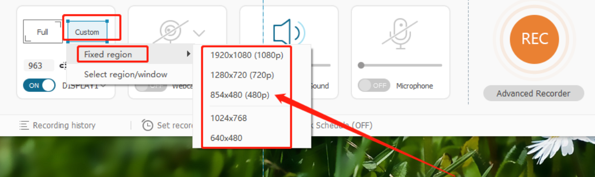 2.进入到录制视频的功能界面之后,我们在界面最左边点击Custom这个选项,然后在出现的选项中点击Fixed region选项可以选择一些标准的视频尺寸。