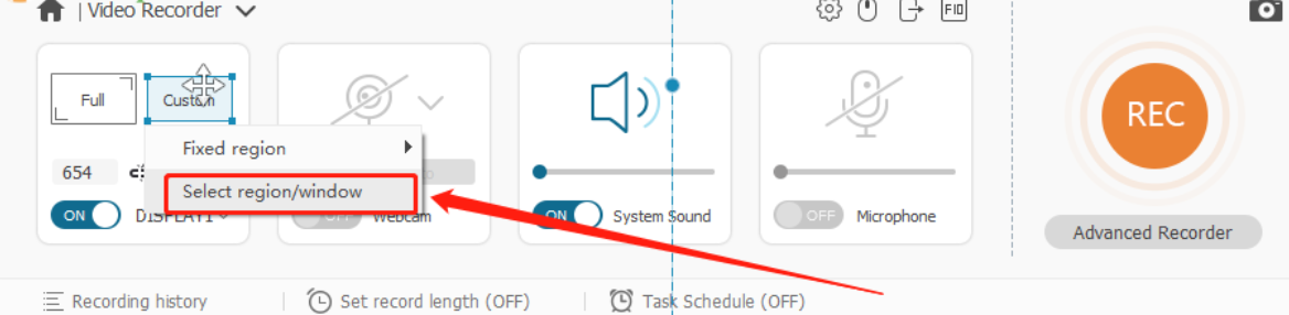 3.另外点击Custom选项下面的Select region/window这个选项就可以自定义选择录制窗口了。