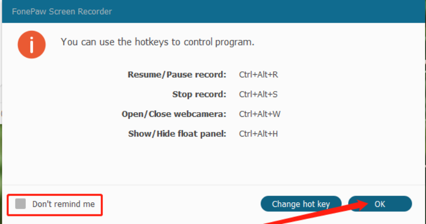 6.点击开始录制之后会出现下图所示的界面,向用户展示录制过程中的快捷键,停止录制时可以通过快捷键来停止录制,用户点击OK按钮即可开始录制操作,也可以点击左边的不再显示选项,这样下次录制就不会显示这个提示界面了。