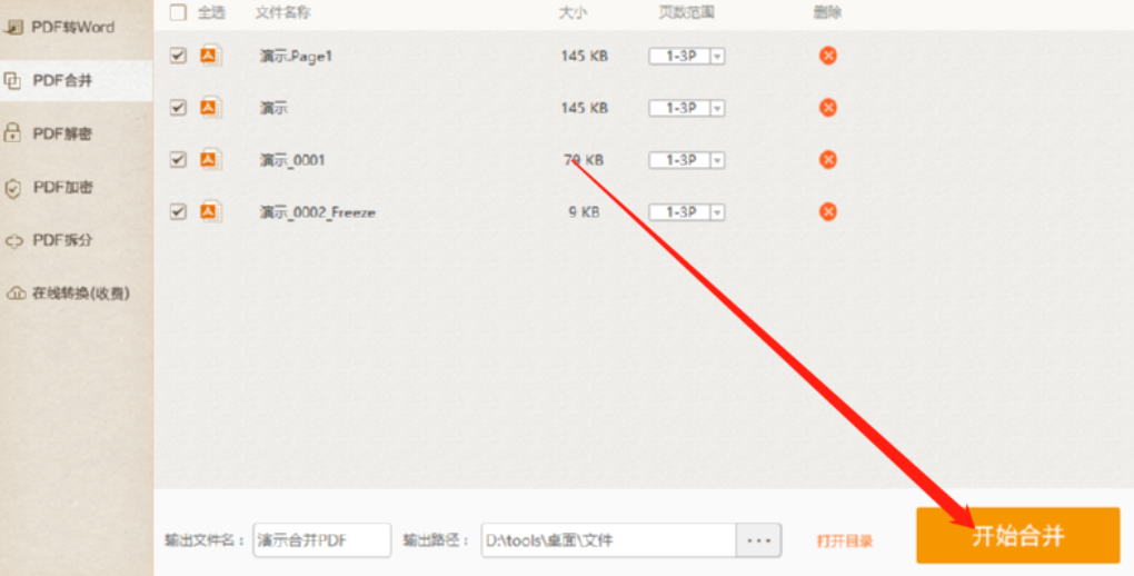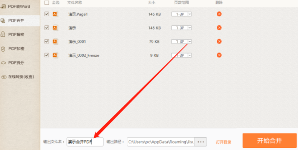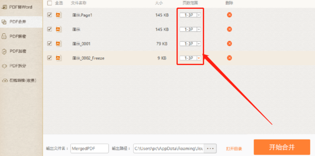 3.点击打开按钮之后我们在界面中就可以看到添加进来的PDF文件了,在页面范围位置可以设置合并PDF文件的页面范围。