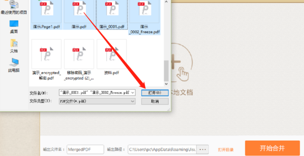 2.点击添加文档之后会出现一个选择文件的界面,在这个界面中我们选择好要合并的PDF文件之后点击右下角的打开按钮。