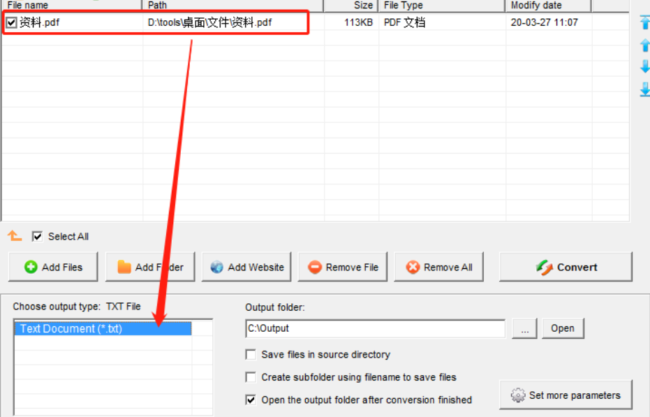 3.选择PDF将它加载到软件界面之后,我们在界面左下方可以看到有想要转换的TXT格式,如下图中所示。