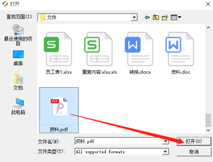 2.点击添加文件之后紧接着会打开一个选择文件的界面,在这个界面中我们选择想要转换的PDF文件即可,然后点击打开按钮。