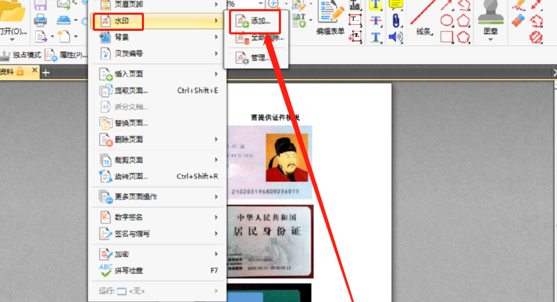 3.点击打开按钮之后文件就添加到软件界面了,然后我们需要点击界面上方的文档选项,在出现的选项中选择水印,选择水印之后点击后面的添加按钮。