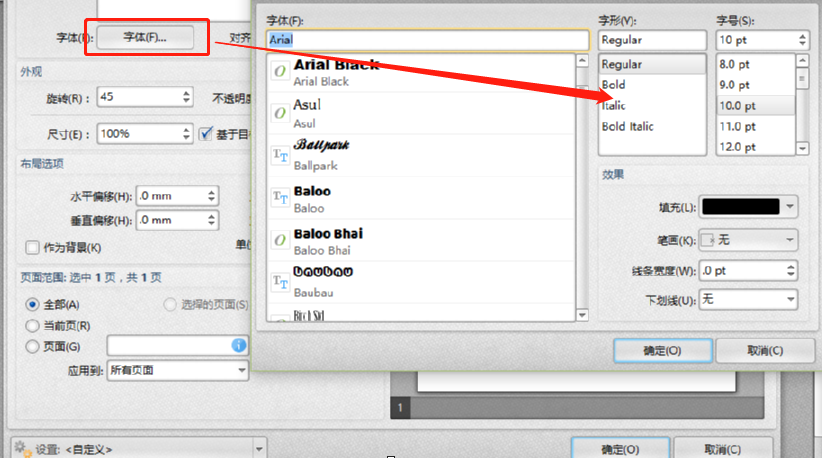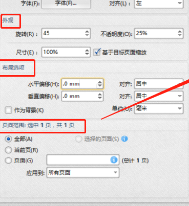5.根据个人的需求设置好水印文字的字体样式之后可以在界面中对水印的外观、布局选项、使用水印的页面进行选择,预览水印效果满意之后点击确定按钮即可。