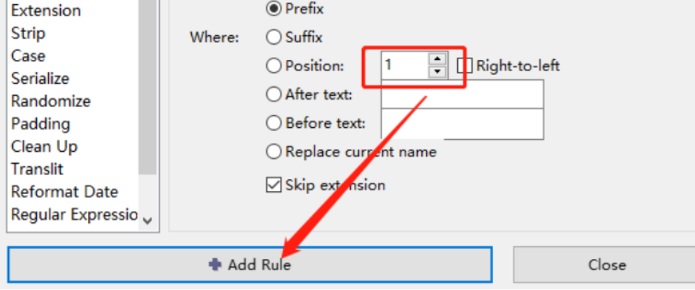 4.点击打开添加重命名规则的界面之后我们在界面中选择想要使用的重命名方式,小编就以常用的Insert这个插入的方式来跟大家演示,选择插入方式之后在输入框中输入想要插入到文件名称中的文字内容,输入之后设置好从第几位开始插入,接着点击Add Rule按钮即可添加这个重命名文件的规则。