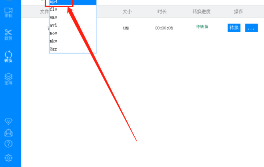 3.点击打开按钮之后我们的文件就添加进来了,然后下一步是在输出格式这个位置选择想要转换的视频格式,打开下拉列表之后选择MP4即可。