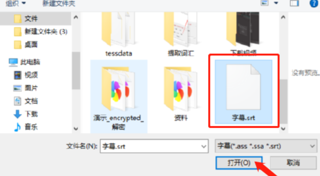 6.点击添加字幕文件这个按钮之后紧接着在打开的选择文件界面中找到想要添加的字幕文件,选中之后点击打开按钮。