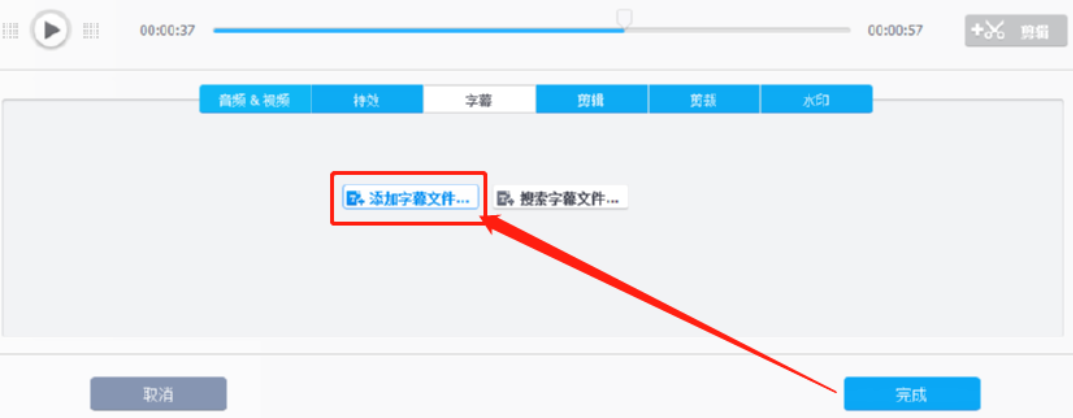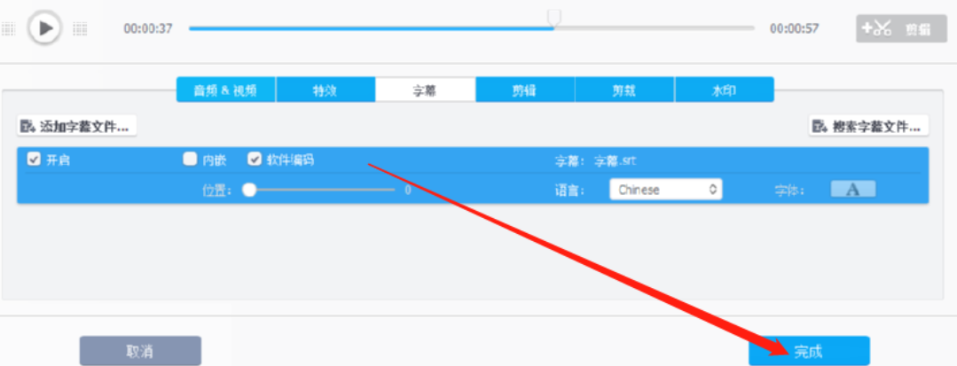 7.点击打开按钮之后字幕文件就选择添加完成了,然后我们可以在界面中看到添加进来的字幕文件,点击完成按钮即可。