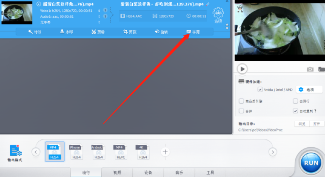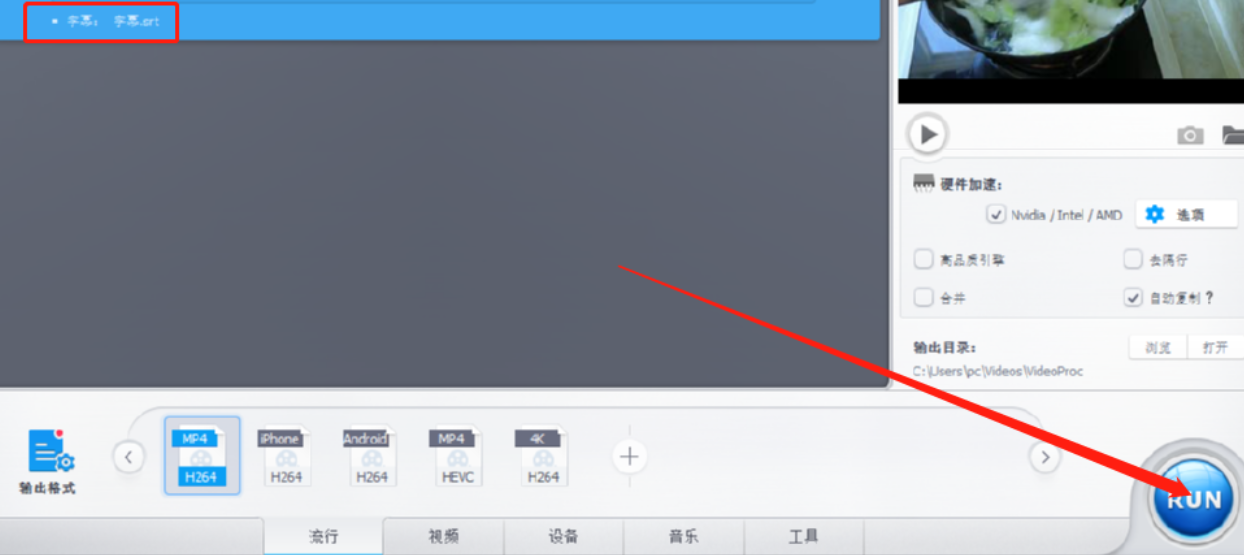 8.最后点击完成之后就会回到软件的主界面了,这时在视频的下方我们可以看到有一个字幕任务选项,然后点击右下角的RUN按钮就可以开始给视频添加字幕的操作了。