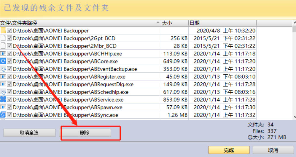 7.再下一步就是扫描与该程序相关的一些残留文件和文件夹,最后全选这些文件夹和文件,点击删除按钮将它们全部删除之后就大功告成了。