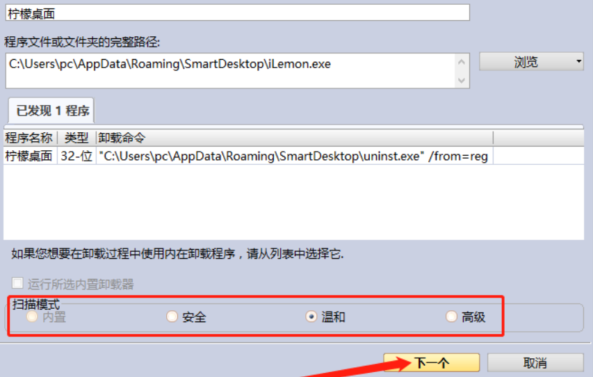 4.选择好想要卸载的程序之后我们在下方的扫描模式这里选择一个想要使用的扫描模式,选择之后点击下一个按钮。