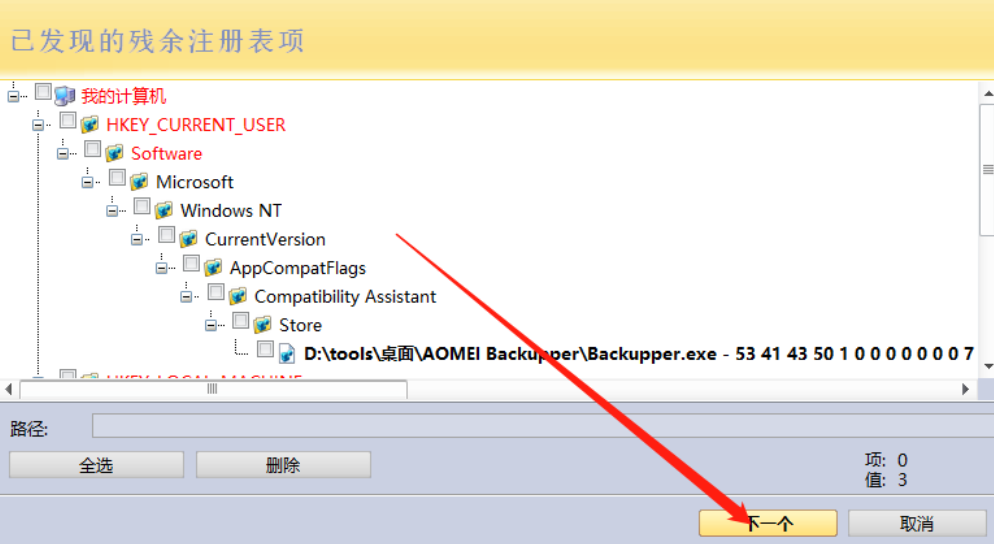 6.等到扫描出来相关的残留注册表项之后我们点击全选按钮然后再点击删除将它们全部删除,删除之后点击下一个按钮。