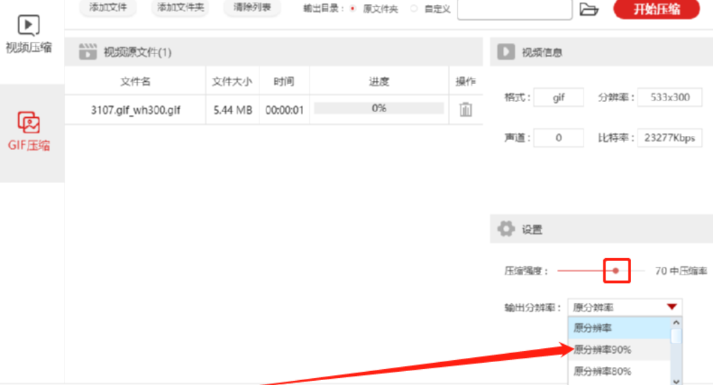 4.紧接着下一步我们在设置模块中可以设置压缩GIF的强度,点击移动圆点选择为中压缩率就可以了,如果文件很大的话可以选择高压缩率,然后还可以设置输出分辨率。
