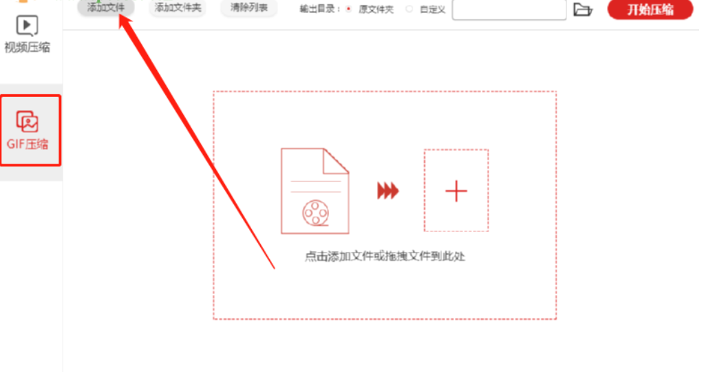 1.首先第一步我们打开软件之后在界面左边点击切换到GIF压缩这个功能界面,然后点击界面中的添加文件按钮。