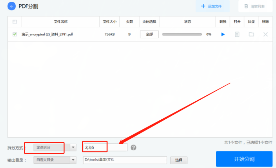 5.另外一种定点拆分的方式就是根据用户的需求来选择分割文件的页面点,小编以“2,3,6”为例,就表示从第二页、第三页第六页进行分割。