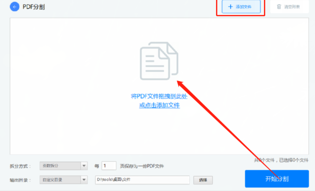 2.进入到PDF分割这个功能界面之后我们点击添加文件按钮或者界面中的图标都可以添加想要分割的PDF文件。